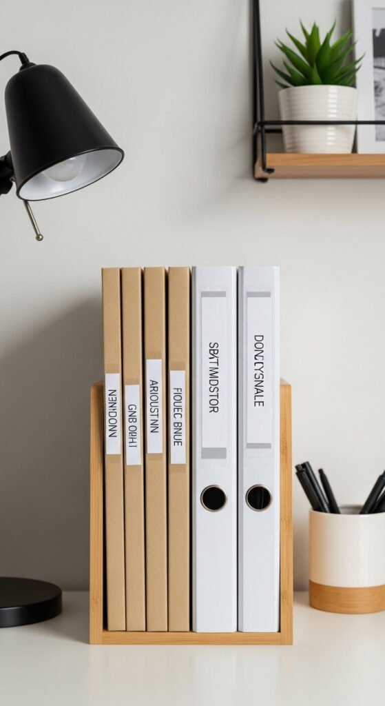 Paper clutter is one of the fastest ways a home office gets out of control. Label every folder, binder, and file box so you can find documents in seconds. Use your label maker to print categories like “Taxes 2024,” “Medical,” or “Car Insurance.” Stick labels on the top edge of folders for easy reading when they’re filed upright. This project costs nothing extra if you already have folders. It takes under 30 minutes and will save you from frantic document searches forever.