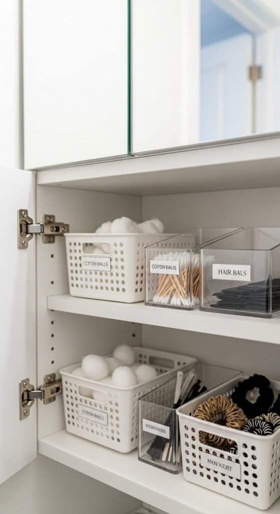 Bathroom cabinets collect clutter faster than almost any other space. Label each basket or bin inside your vanity so everyone in the house knows where things live. Categories like “Hair,” “Skincare,” “First Aid,” and “Extras” work well. Use waterproof label tape if your label maker supports it — bathrooms get humid. Clear acrylic bins from the dollar store or Amazon work great here and let you see the contents. This project takes about 15 minutes and keeps the whole bathroom running smoothly.