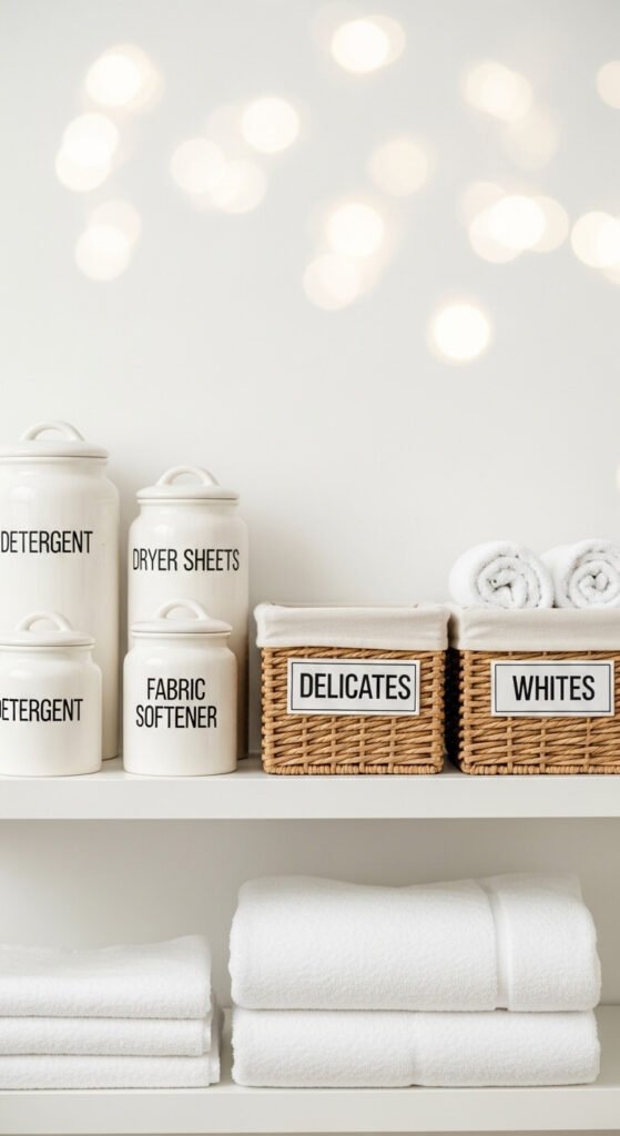 The laundry room is a high-traffic utility space that benefits a lot from clear labeling. Label bins for detergent pods, dryer sheets, stain remover, and lint rollers so everything has a dedicated spot. If you share the laundry space with roommates or family members, labeled bins reduce confusion and keep supplies stocked. Print labels in a slightly larger font for easy reading while your hands are full of laundry. Add a “Low — Reorder” label to a small bin where you move items when you’re running out.