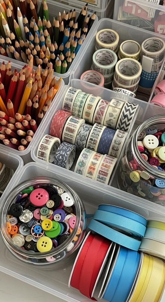 Craft rooms can go from inspiring to overwhelming very quickly. Label every single container — from pencil cups to ribbon rolls to paint jars. Use color-coded label tape to sort by supply type: blue for paper goods, yellow for adhesives, red for tools. This makes it easy to grab what you need mid-project without digging. Clear containers plus clear labels is the winning combo. You can find stackable clear bins at IKEA’s SAMLA range for under $5 each.