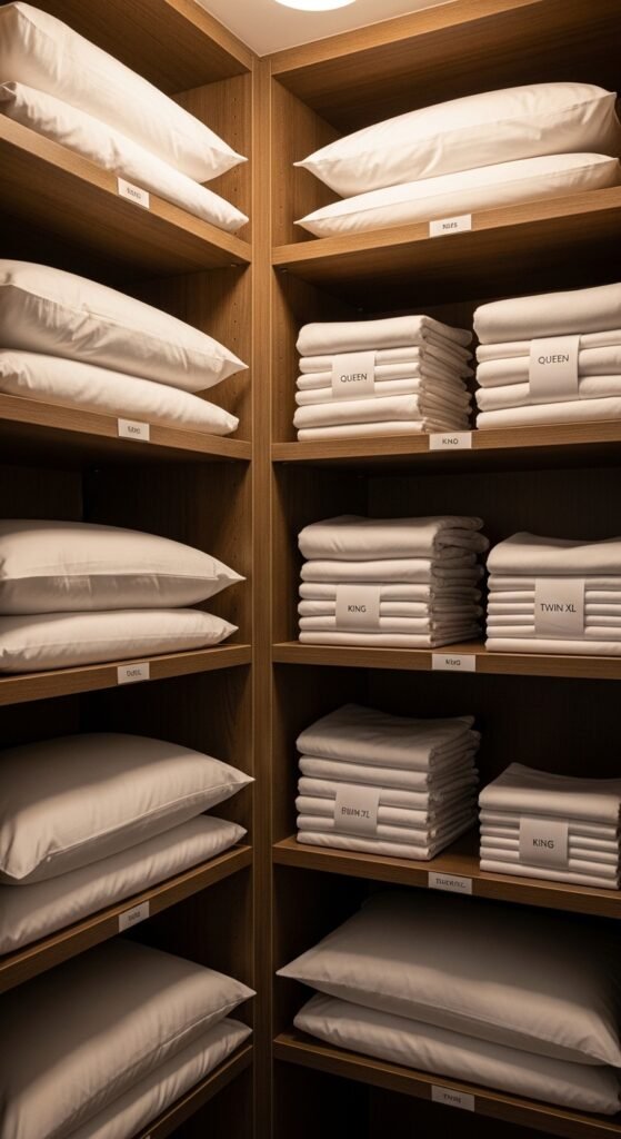 Ever pulled out a sheet set only to find it’s the wrong size? Label each folded sheet set by bed size — Twin, Queen, King, Cal King — so there’s no guessing. Store the flat sheet, fitted sheet, and pillowcases folded together inside one pillowcase, then label the outside. You can also add a label to the shelf edge itself. This project takes minutes and eliminates one of those small daily frustrations. Stack by size, label clearly, and never unfold the wrong set again.