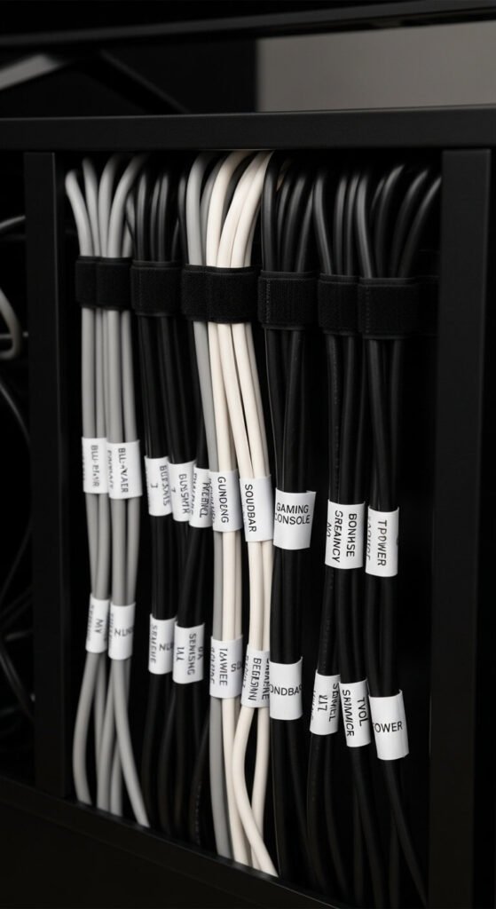 Label every cord behind your TV, desk, or entertainment center. Wrap a small flag label around each cable near the plug so you know exactly what it powers before you unplug anything. Use abbreviations like “TV HDMI 1,” “Gaming,” or “Soundbar.” This is a small project with huge payoff — no more accidentally unplugging the wrong thing. You can also label extension strips at each socket. Spend 20 minutes once and save yourself from cable chaos forever.