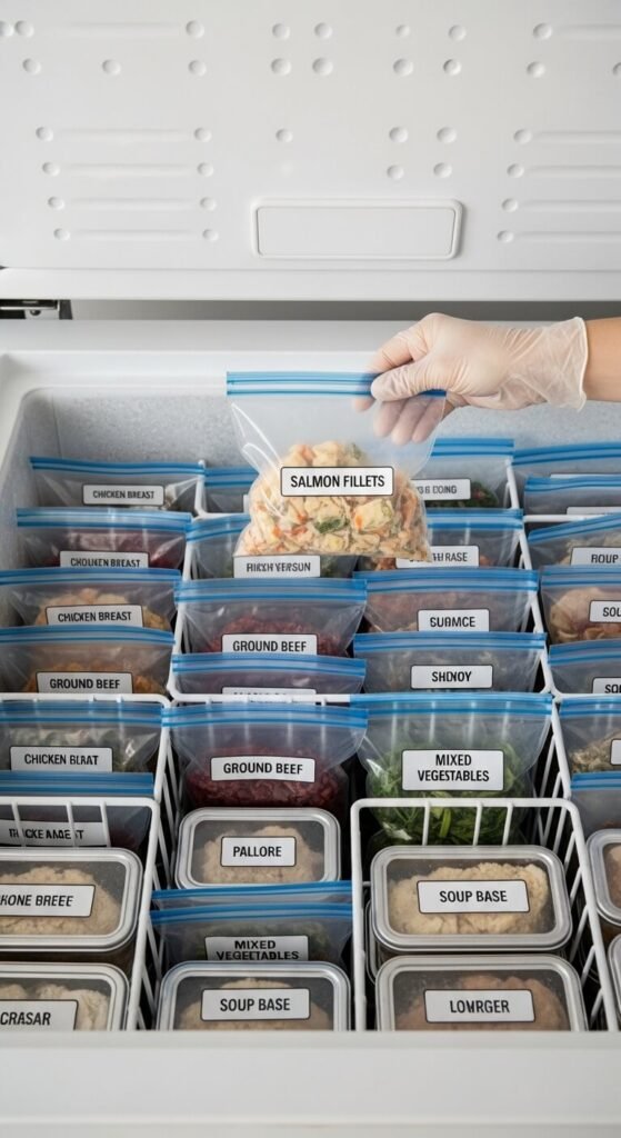 A chest freezer without labels is basically a mystery box. Label every bag and container with the contents and date before freezing. Use freezer-safe label tape or waterproof tape that can handle cold temperatures. Organize by category — meats, vegetables, prepared meals — and label each section with a printed divider card placed in the freezer. Rotate stock by moving older items to the front. This project is free if you already have label tape and will prevent freezer burn waste significantly.