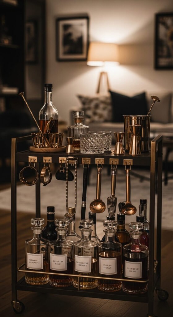 A labeled home bar looks intentional and put together. Print labels for decanters so guests — and you — always know what’s inside. Label drawers for tools like jiggers, muddlers, and corkscrews. Create a small section labeled “Mixers” or “Garnishes” to keep the bar cart tidy. If you use a cart, label each tier. Black or gold label tape on clear decanters looks especially sleek. This project costs nothing if you have the tape and takes about ten minutes.