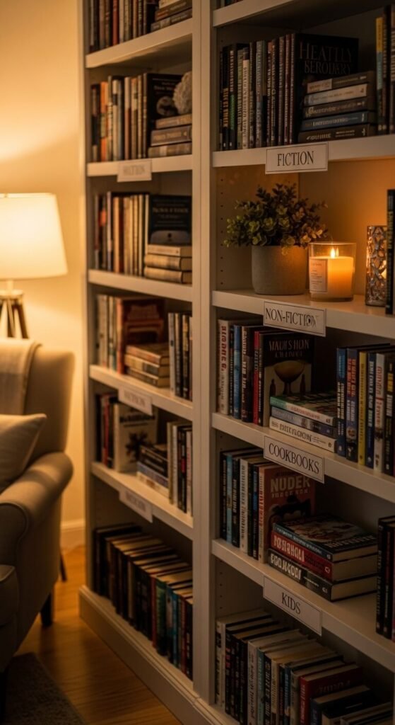 Organize your bookshelf by genre and label each section with a printed shelf divider. Cut a piece of cardstock, fold it into an L-shape, and attach your printed label to the front tab. Sections like “Fiction,” “Non-Fiction,” “Reference,” “Cookbooks,” and “Kids” make browsing easy. This is a great weekend project and makes your bookshelf feel like a tiny curated library. It costs almost nothing — just label tape and cardstock you probably already have.
