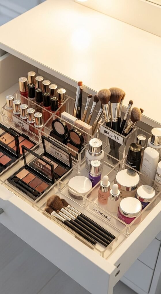 A labeled makeup drawer turns your daily routine from a scramble into something almost enjoyable. Label each compartment in your acrylic organizer — “Lips,” “Eyes,” “Foundation,” “Brushes,” “Skincare.” This removes the morning decision fatigue of digging through products. Clear organizer trays with printed labels look incredibly clean and are easy to photograph for a satisfying before/after. Affordable organizer trays start at around $10. Label, organize, and enjoy the calm of a tidy vanity.