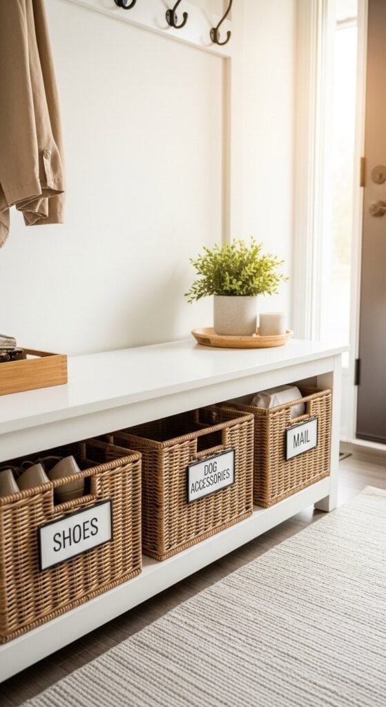 The entryway is the first thing you — and guests — see. Label baskets under your entryway bench for shoes, bags, dog leashes, or mail. This contains the natural clutter that collects near doors. Choose baskets that match your decor and place a simple printed label on the front. Even one labeled basket makes the space look more thought-out. Add a labeled hook rail above for coats, backpacks, and keys. Small effort, big visual impact.