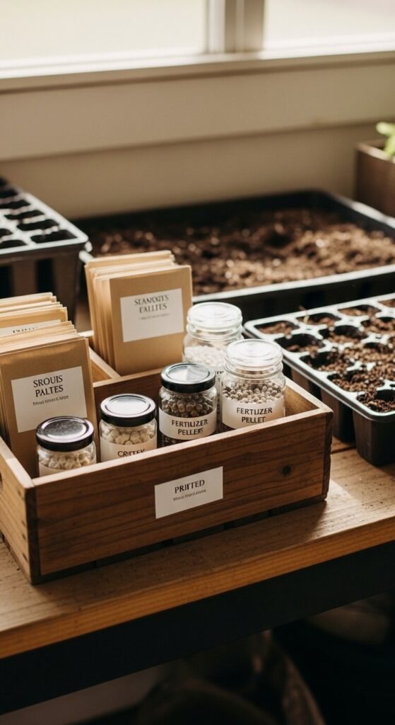 Gardeners know the chaos of unlabeled seed packets and mystery soil bags. Label every seed packet, container, and garden tool in your supply area. Print labels with seed name and planting date, then store packets in a labeled index card box organized by season. Label your fertilizer jars, spray bottles, and tool hooks. A labeled garden station makes every planting session more efficient. This also helps you track what worked and what didn’t season to season.