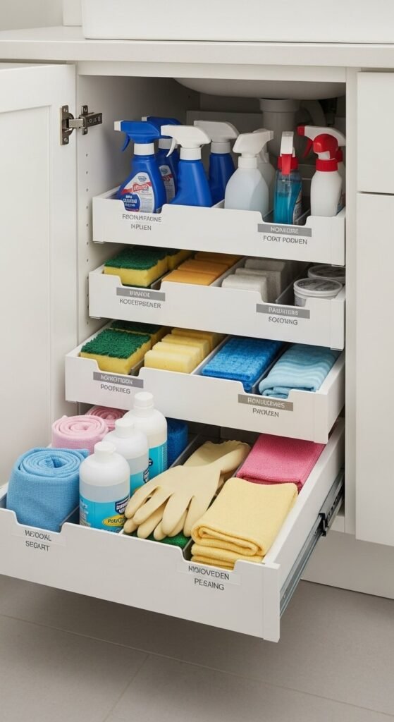 The cabinet under your sink deserves a system. Label bins for each type of cleaning supply — “Bathroom,” “Kitchen,” “Glass,” “Floor,” “Extras.” This way, whoever is cleaning grabs the right product without hesitation. Tuck refill items in a labeled back section. Print a small label for your spray bottles too — especially helpful if you make your own DIY cleaners. This project takes about 20 minutes and makes your cleaning routine faster. Label clearly, stock smartly, and maintain it easily.