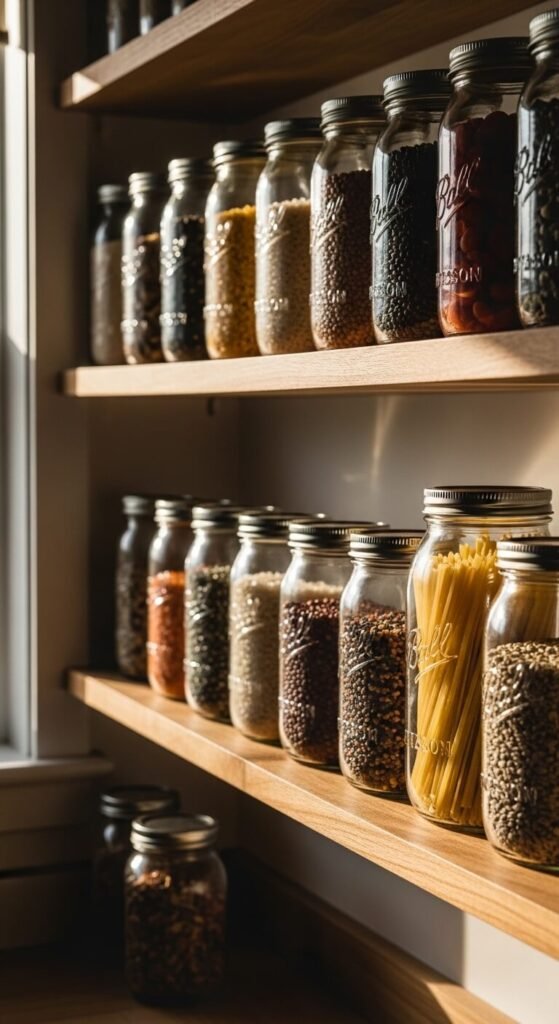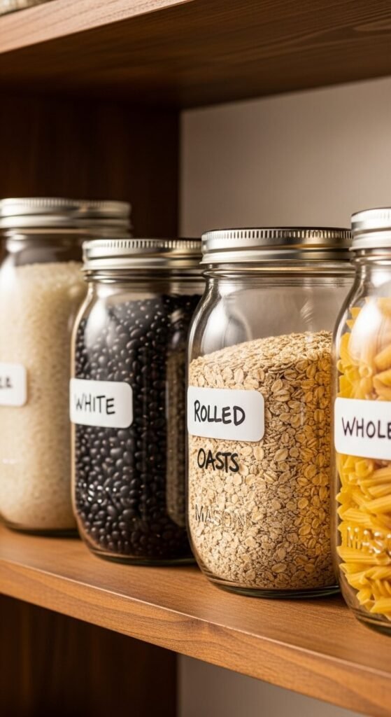 Store dry pantry goods like rice, lentils, oats, and flour in mason jars instead of their original bags. Bags rip, spill, and take up awkward space. Jars stack neatly and let you see exactly what’s running low. Use a permanent marker directly on the lid to label each jar. Wide-mouth quart jars work best for bulky items. You can grab a case of 12 for around $10–$12 at most hardware or grocery stores.