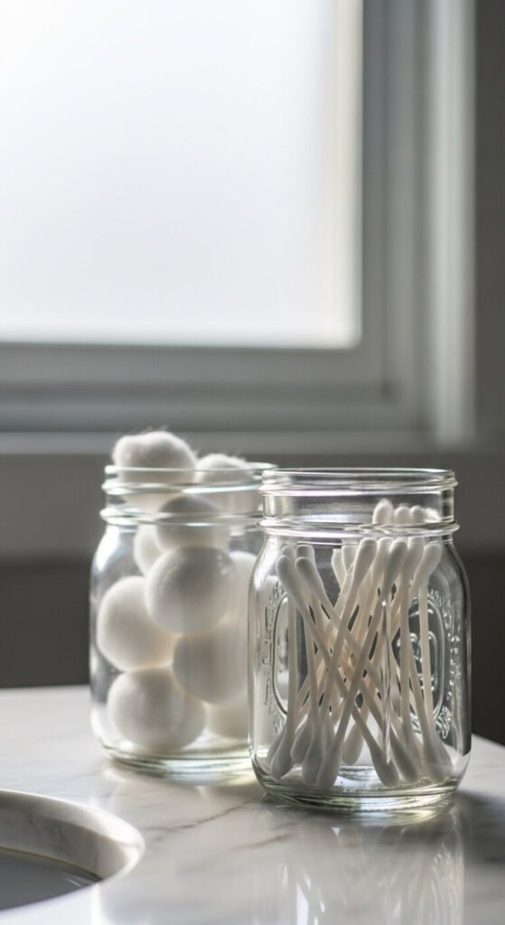 Stop buying fancy bathroom canisters. A small mason jar does the same job for almost nothing. Fill one with cotton balls and another with Q-tips. Place them on your bathroom counter for easy access. The glass looks clean and simple against tile or marble. Use half-pint jars — they’re the right size and don’t crowd your counter. If you want a lid, the standard two-piece metal lid works perfectly.