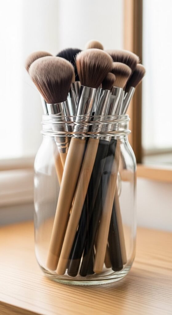 A wide-mouth mason jar makes a perfect makeup brush holder. Stand your brushes upright with the bristles facing up. Add a layer of decorative stones or dried beans at the bottom to keep brushes from shifting. It keeps your vanity tidy and your brushes easy to grab. Pint-sized jars fit most brush collections. This costs you nothing if you already have a jar at home.
