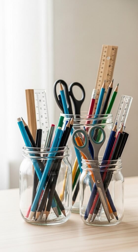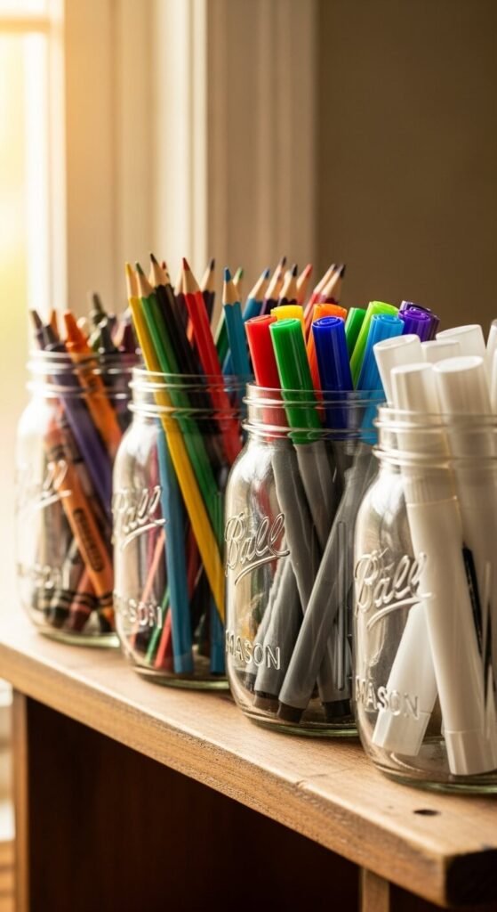 Set up a low shelf with mason jars filled with crayons, markers, colored pencils, and glue sticks. Put it at your child’s height so they can grab and return supplies independently. It teaches organization and reduces clutter on the kitchen table. Use one jar per supply type. Wide-mouth pint jars are roomy enough for fat crayons. You can decorate the outside with chalkboard paint so kids can label their own jars.