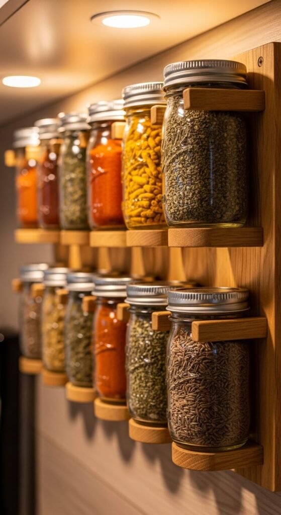 Screw mason jar lids directly onto a piece of reclaimed wood or a thin board. Then screw the jars into the lids. Hang the board on your kitchen wall. You get a spice rack that frees up drawer and cabinet space. Fill each jar with a labeled spice. Half-pint or 4-oz jars work best. A board, a few screws, and your jars — that’s the whole project. Total materials cost can be under $5.