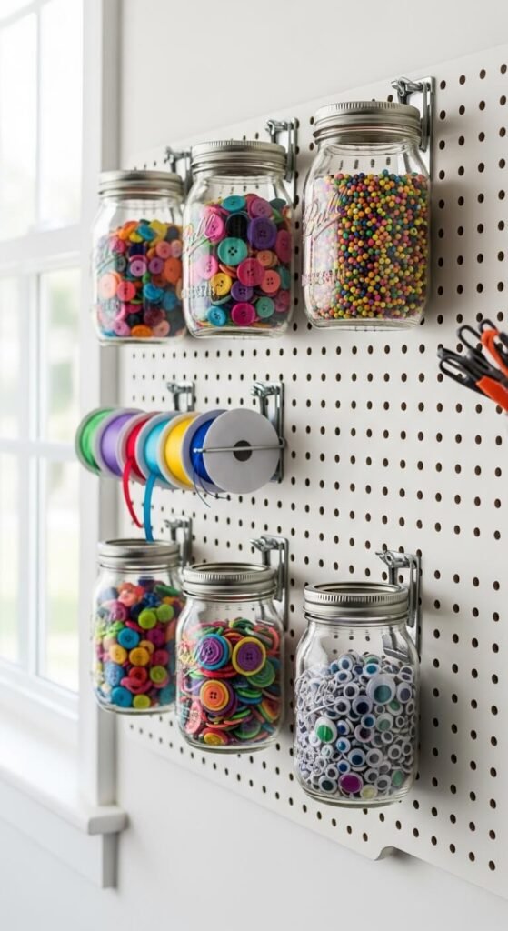 Sort buttons, beads, ribbons, googly eyes, and other small craft supplies into labeled mason jars. Attach them to a pegboard using metal hose clamps for a wall-mounted craft station. This keeps small pieces off your work surface and easy to spot. Use 4-oz or half-pint jars for the smallest supplies. Label with tape and a marker. It’s a practical setup that costs very little to build.