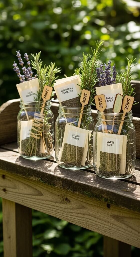 Keep seed packets, plant markers, and small gardening tools organized in mason jars. Store labeled seed packets upright inside a wide-mouth quart jar so you can flip through them like a card file. Seal the jar tightly to protect seeds from moisture. Use a separate jar for twist ties, labels, or string. This is a simple system that keeps your potting bench or shed tidy all season.