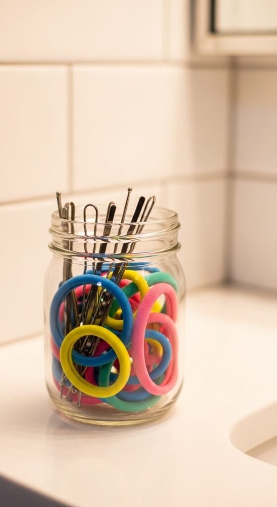 Hair ties and bobby pins disappear constantly when left loose. Drop them into a small mason jar on your bathroom counter and they stay put. Use a 4-oz jar for bobby pins and a half-pint for hair ties. The glass keeps them visible so you’re not digging through a drawer. It takes 10 seconds to set up and costs nothing if you have a spare jar. Simple and effective.
