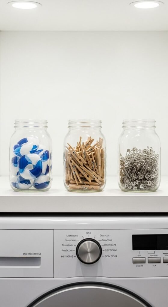 Use mason jars in your laundry room to hold dryer balls, clothespins, laundry pods, and safety pins. Swap out those bulky detergent bags for a clean jar on the shelf. It keeps supplies visible and the shelf looking tidy. A wide-mouth quart jar holds a full pack of laundry pods perfectly. Half-pint jars are great for clothespins. Label each lid with a permanent marker for quick ID.
