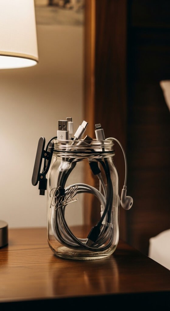 Coil extra charging cables and tuck them into a mason jar next to your charging station. Loop each cable loosely so it doesn’t tangle. Use a pint jar to hold two or three cables. Add a binder clip on the jar’s rim to keep the active cable from slipping behind furniture. It’s a quick fix for one of the most common sources of desk and nightstand clutter. Free if you already have a jar.