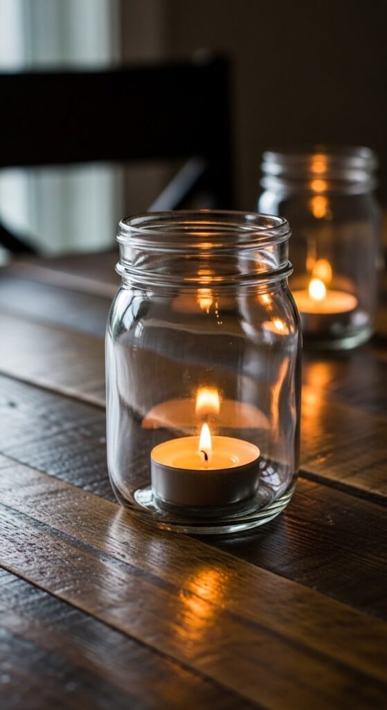 Drop a tea light or votive candle inside a mason jar for an instant candle holder. The glass protects the flame and throws beautiful warm light around the jar. Use pint or quart jars for larger pillar candles. Group three together for a simple centerpiece. You can add a little sand or salt to the bottom to hold the candle upright. Tea lights cost about $5 for 50 — this whole setup is nearly free.