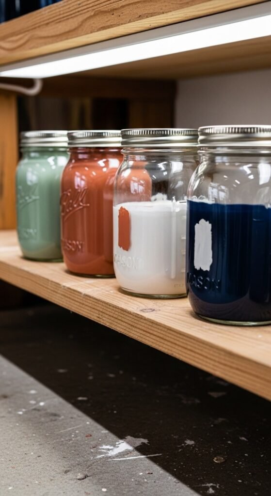 Pour leftover wall paint into mason jars for easy touch-up storage. Paint the lid with the color inside so you can identify it at a glance. Wide-mouth pint jars are ideal for small amounts. Seal tightly and store in a cool, dry spot. This beats dealing with half-open paint cans that dry out and spill. Label each jar with the room it belongs to. A permanent marker on the lid works perfectly.