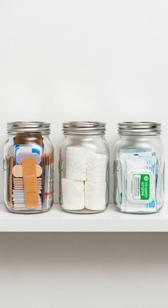 Sort first aid supplies into mason jars so you can find what you need fast. Use separate jars for bandages, gauze, and antiseptic wipes. Label each one clearly. Wide-mouth jars make it easy to reach in and grab items quickly. Store them in a bathroom cabinet or on a shelf. You’ll always know what’s running low without digging through a cluttered first aid kit. Pint and half-pint jars work well here.