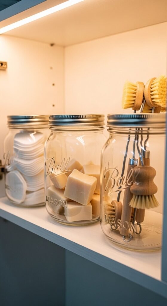 Store small bathroom cleaning supplies — spare soap bars, cleaning pads, scrub brushes — in mason jars inside your cabinet. It keeps loose items from rolling around and makes restocking simple. Use quart jars for bulkier items and half-pints for smaller ones. Line the shelf with two or three labeled jars and you’ll immediately see what’s low. It takes five minutes to set up and costs you nothing extra.