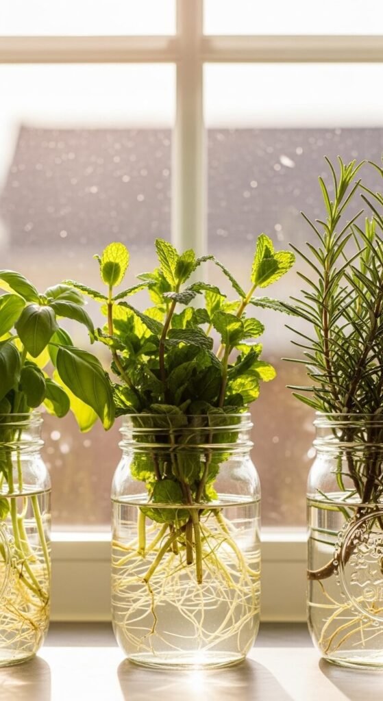 Grow small herbs like basil, mint, or rosemary right in mason jars on your windowsill. Use wide-mouth jars with drainage holes drilled in the bottom, or grow cuttings in water for a no-soil option. Quart jars give roots plenty of room. Place in a sunny window and water regularly. Fresh herbs at arm’s reach while cooking is one of the most practical upgrades you can make in the kitchen. Seeds cost about $2 a pack.