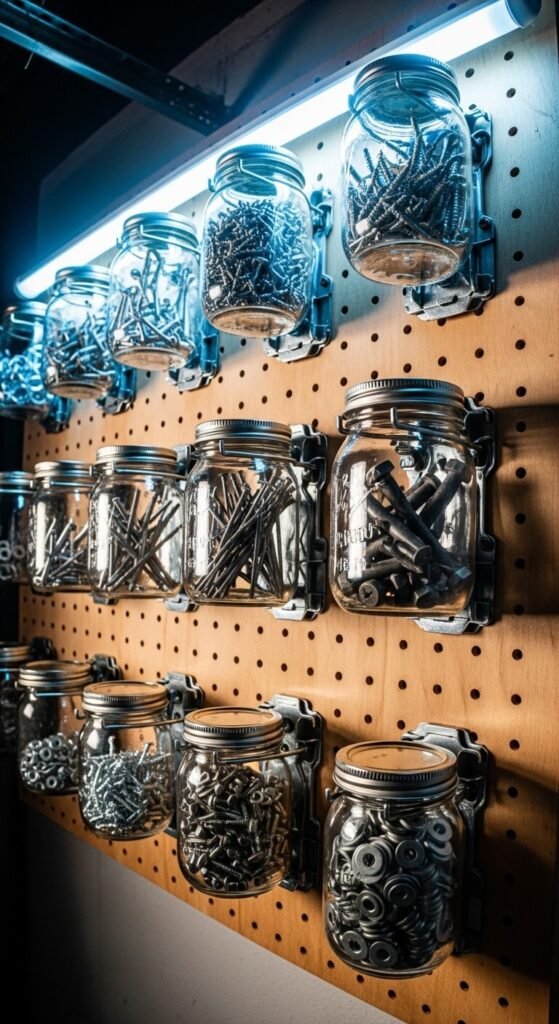 Mount mason jars on a garage pegboard using hose clamps and sort screws, nails, bolts, and washers by type. Seeing your hardware through clear glass saves time hunting through mixed-up bins. Use small 4-oz jars for tiny screws and pint jars for larger bolts. Label the lid so you know what’s inside when the jar is full. This is one of the most satisfying garage upgrades you can do for almost no money.