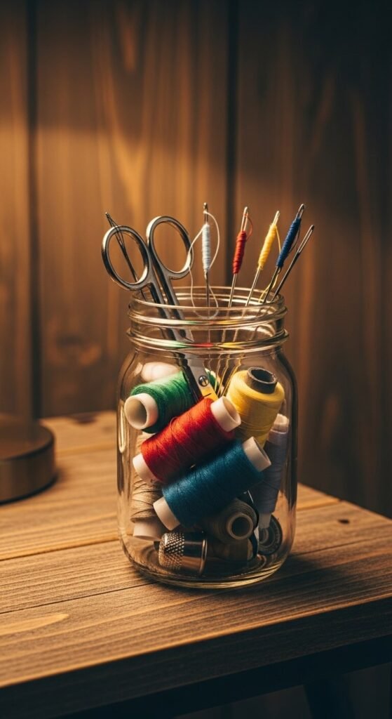 Keep a mason jar on your sewing table or in a closet filled with basic mending supplies: thread spools, needles, a thimble, and small scissors. A wide-mouth quart jar holds everything you need for quick repairs without searching through a full sewing box. Drop in a pincushion cut to fit the opening and you have a compact, self-contained kit. It takes minutes to put together and uses supplies you already own.