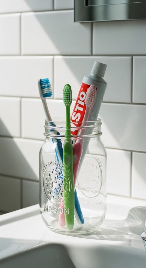 Replace a plastic toothbrush holder with a wide-mouth mason jar. It holds three to four toothbrushes upright with no wobbling. The glass is easy to rinse clean and looks better than most store-bought holders. Add a small amount of rice or pebbles to the bottom to keep brushes stable. A half-pint wide-mouth jar is the right size. This is a free swap if you have a spare jar and it makes a real difference in how clean your counter looks.