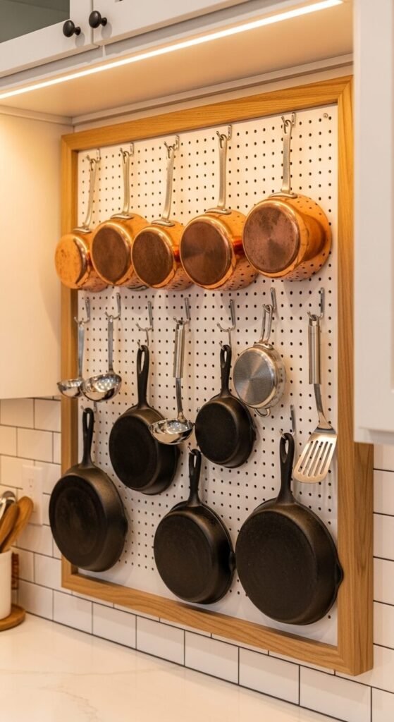 A pegboard in the kitchen turns wasted wall space into working storage. Mount it between your upper cabinets or above a prep counter. Use S-hooks to hang pots, pans, ladles, and whisks. Add small wire baskets to hold spice packets or cooking oils. The whole setup keeps your most-used items within arm’s reach. Framing the board with simple pine trim makes it look like a planned design feature rather than an afterthought. Total cost for a 2×4 section: around $20–$30.