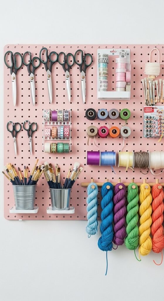 Craft rooms live and die by organization. A pegboard gives you a place for scissors, tape, ribbon, yarn, and brushes — all visible at once. Use wooden dowels to hold ribbon and yarn spools. Hang small acrylic bins for pens, markers, and glue sticks. The trick is grouping similar tools together by project type so you can grab what you need without digging. Pick a board color that matches your room’s palette. Light pink, sage green, or crisp white all work beautifully in a craft space.