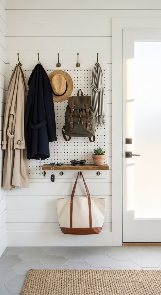 Stop losing your keys. A pegboard drop zone near your front or back door gives you one place to hang bags, coats, umbrellas, and keys every single time you walk in. Add a small shelf ledge for mail and sunglasses. Use heavy-duty hooks for coats and lighter ones for bags and lanyards. If you frame the board with trim and paint it to match your wall, it looks like built-in furniture. This is a weekend project that takes two hours and costs around $25.