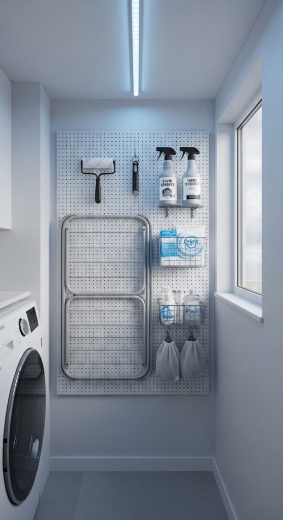 Laundry rooms are often tight on space. A pegboard on the wall above or beside your machines gives you a spot for everything from lint rollers and stain sprays to extra hangers and mesh laundry bags. Hang a collapsible drying rack directly on the board so it’s out of the way when not in use. A 2×3 section works well in most laundry rooms. Use all-white hooks and bins for a clean, cohesive look that makes even a small space feel organized.