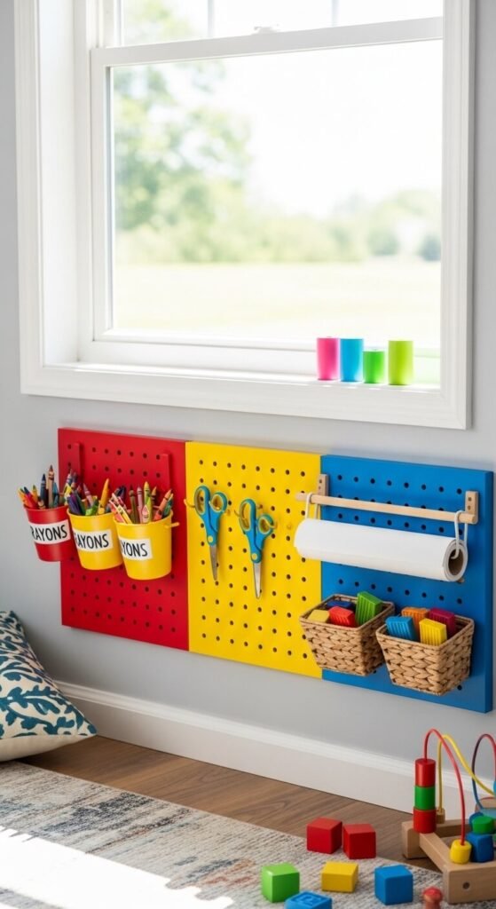 Mount a pegboard at your child’s eye level and let them own their creative space. Use bright paint colors or chalkboard paint for a board that doubles as a drawing surface. Hang chunky hooks for safety scissors and label each bin with a picture, not just words, so younger kids can find and put things away themselves. A 2×4 section cut down to 2×2 is the right size for a kids’ station. This keeps art supplies off the kitchen table and gives kids independence over their own tools.