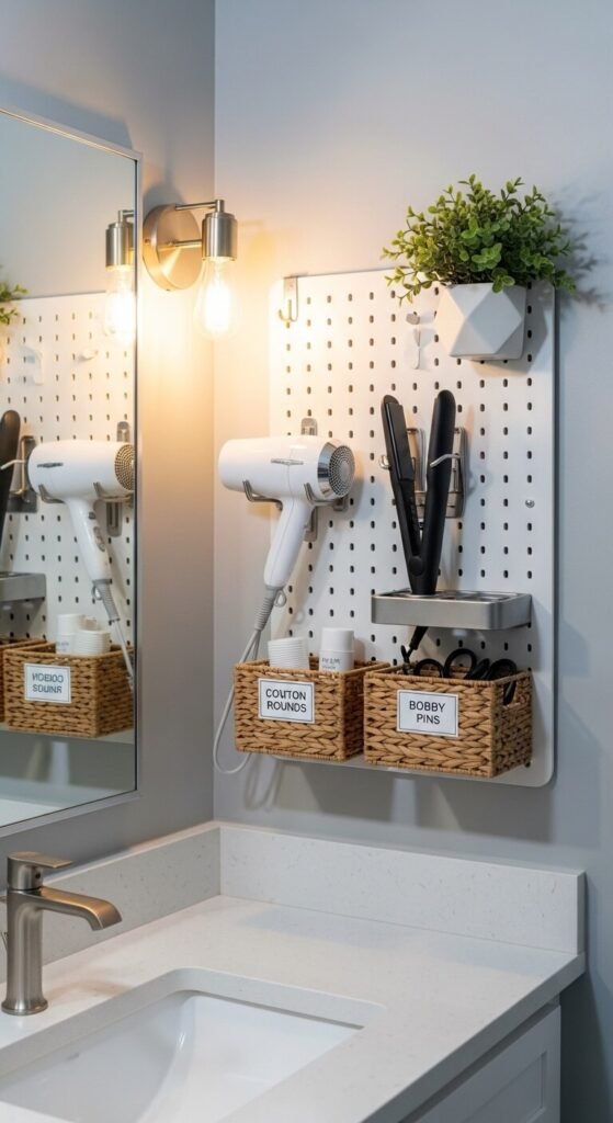 A bathroom pegboard keeps your counter clear without sacrificing convenience. Mount it beside the vanity mirror and hang your hair dryer, flat iron, and styling tools with custom-sized hooks or repurposed tool holders. Small wire baskets hold cotton rounds, pins, and hair ties. Make sure to use a moisture-resistant sealant on the board since bathrooms deal with humidity. A 1×2 foot section is usually plenty. This is one of the most underused spots in the house for pegboard, and it works surprisingly well.