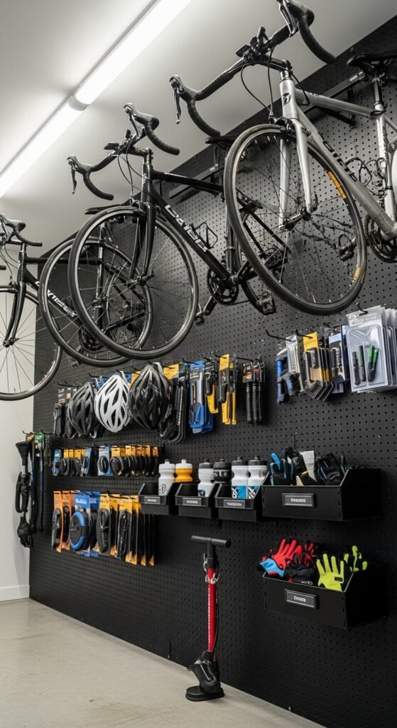 Bikes take up enormous floor space when leaned against a wall. Heavy-duty J-hooks made specifically for bike storage mount directly to a pegboard and hold road and mountain bikes off the ground. Below the bikes, hang your helmets, pumps, and repair tools so everything for a ride lives in one spot. This setup makes it faster to grab your gear and go. A heavy-gauge pegboard rated for higher loads handles the bike weight with no problem and costs about the same as standard board.