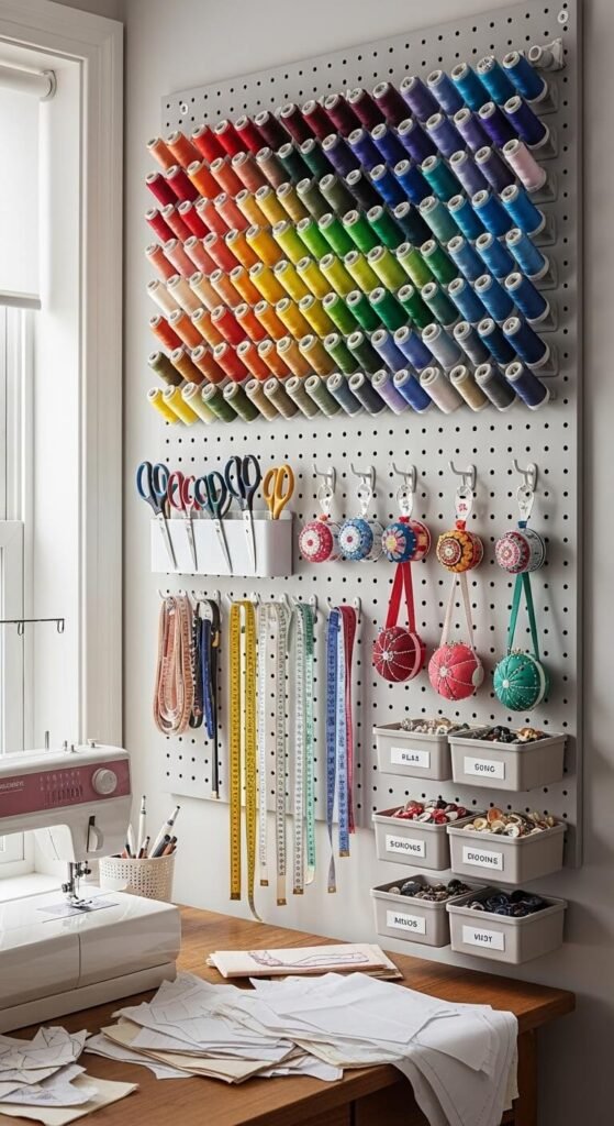 Sewing rooms have hundreds of small items that disappear into drawers. A pegboard wall keeps everything visible and sorted. Use long wooden dowels to organize thread by color — it looks intentional and makes color matching much faster. Hang your cutting mats, rulers, and scissors on the same board so you’re not hunting across the room mid-project. Add a row of magnetic hooks for pins and small metal tools. This kind of organized display also doubles as attractive decor for a creative workspace.