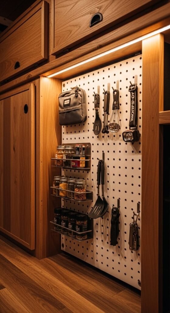 Pegboards aren’t just for houses. In a van build or RV, they’re one of the cleverest uses of a vertical wall surface. Mount a lightweight pegboard panel using L-brackets bolted to studs in the wall frame. Use locking hooks so items don’t rattle loose while driving. Keep cooking tools, a headlamp, and everyday essentials on the board where you can grab them without digging through storage bins. A 2×2 panel adds significant functional storage in a small-space build without adding much weight.