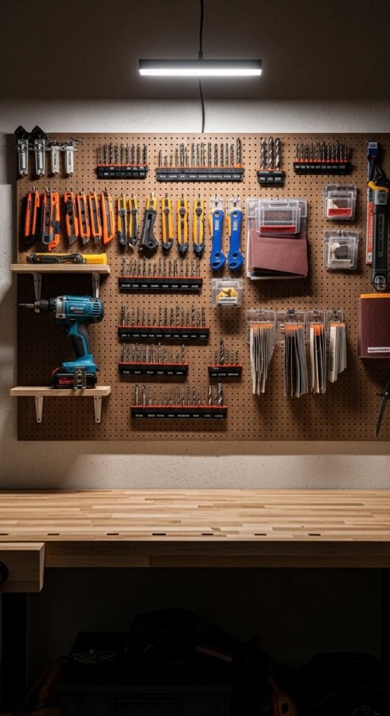 The wall directly behind a workbench is prime real estate. A pegboard that spans the full width of your bench keeps every tool within arm’s reach while you work. Outline your tools with a paint marker so you always know where each one belongs and can spot a missing tool at a glance. Use a combination of hooks, bins, and small shelves. Add a power strip to one end for corded tools. This classic setup looks professional because it is — it’s the same layout pros use in workshops every day.