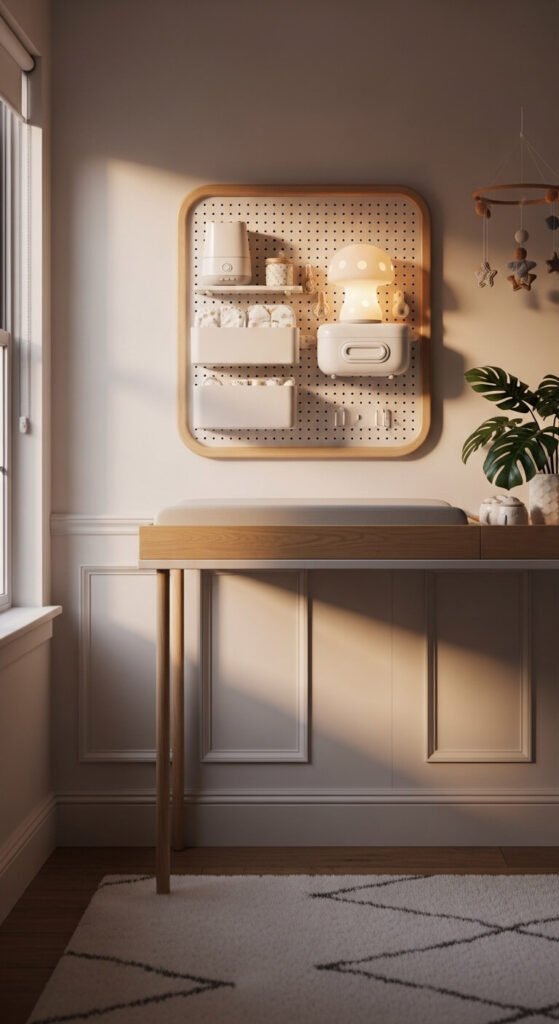 A small pegboard above the changing table keeps everything you grab at 2 a.m. within reach. Mount a 2×2 foot panel and use it to hold a diaper caddy, wipes, nightlight, and baby monitor. Choose rounded-corner hooks and smooth-finish accessories to keep the look soft and safe. A white board with white hooks disappears into a light-colored nursery and looks completely intentional. You can add or move hooks as the baby grows and your storage needs change.