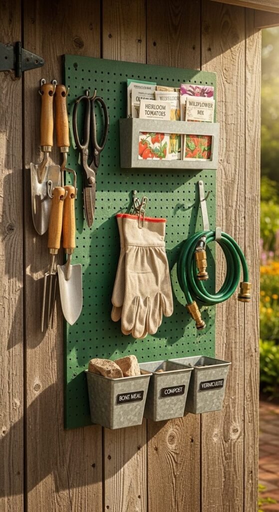 A pegboard on the interior wall of your garden shed or garage keeps outdoor tools organized and off the floor. Use a weatherproof pegboard — HDPE plastic boards handle moisture far better than hardboard in outdoor or semi-outdoor spaces. Hang trowels, shears, gloves, and small rakes on standard hooks. Add a row of labeled bins for seeds, plant ties, and soil amendments. The setup makes it easy to do a quick inventory before a garden trip and keeps your shed looking clean rather than chaotic.