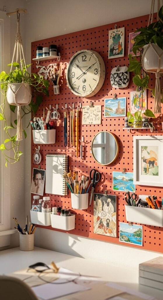 A pegboard doesn’t have to look industrial. Paint it an accent color — terracotta, forest green, deep navy, or warm mustard — and it becomes a design feature, not just storage. Mix functional hooks with decorative elements like small plants, framed artwork, and mirrors. The board becomes a living wall display that you rearrange seasonally. This works especially well in a studio, bedroom, or home office. Use spray paint for the smoothest finish and let it cure fully before mounting hooks.