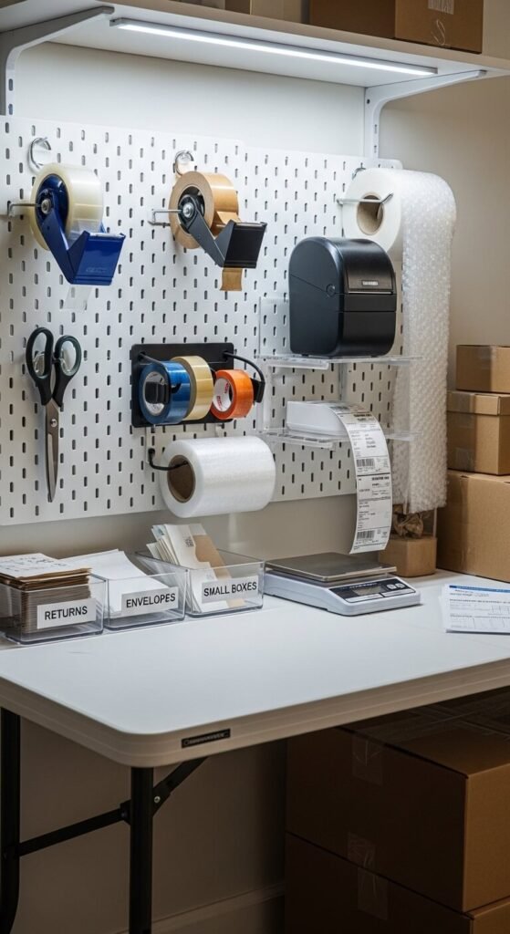 If you run a side hustle or small product business from home, a pegboard shipping station changes everything. Mount a board above your packing table and hang your tape dispensers, scissors, label printer, and scale on a small pegboard shelf. Group tools by task — sealing tools on one side, labeling tools on the other. Add labeled bins for different envelope sizes and shipping materials. This kind of setup turns a chaotic dining table situation into a real workspace that’s faster and less stressful to use.