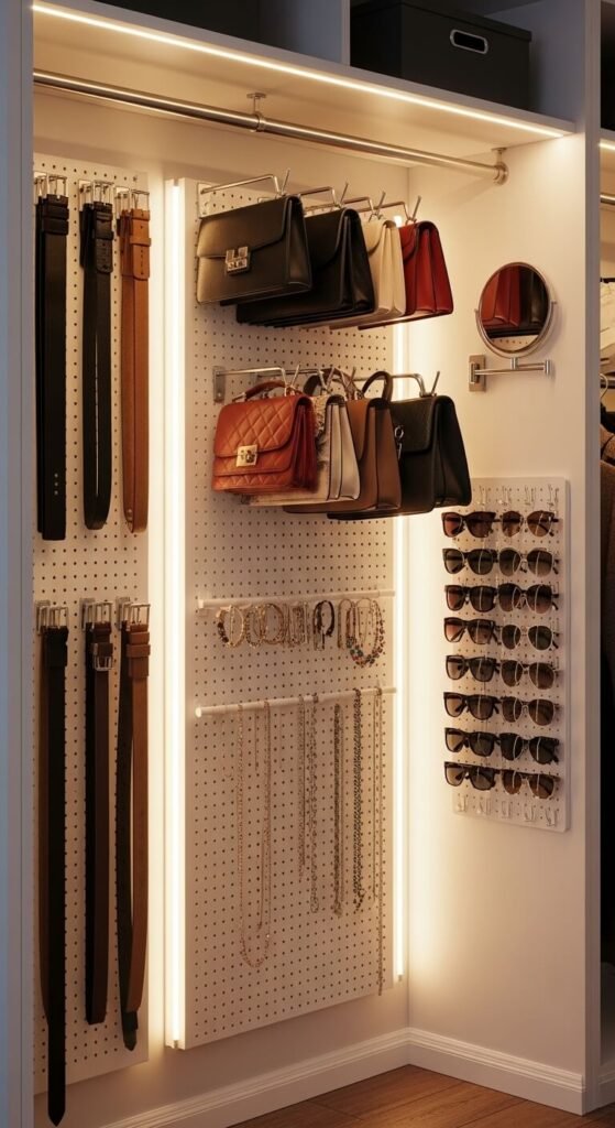 The back wall of a closet is almost always wasted space. A slim pegboard panel turns it into a full accessory organizer. Hang belts, scarves, and bags on tiered hooks to keep everything visible and wrinkle-free. Add a small mirror using pegboard clips so it’s adjustable. A jewelry bar or small hooks handle necklaces and bracelets without tangling. This kind of system costs less than a standard accessory organizer from a home store and uses space that already exists in your home.