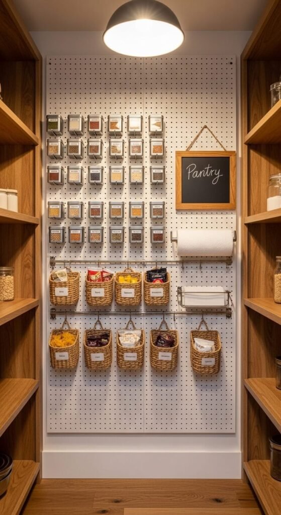 A pegboard inside your pantry or on a kitchen wall gives you a second layer of storage beyond shelves. Use magnetic spice tins on pegboard with hook-compatible magnetic mounts so spices are visible and labeled from the front. Hang small wire baskets for snack pouches, tea bags, and individual condiment packets. Add a paper towel holder hook near the prep zone. This setup works especially well in rental kitchens where you can’t install permanent shelving — the board mounts with just four screws.
