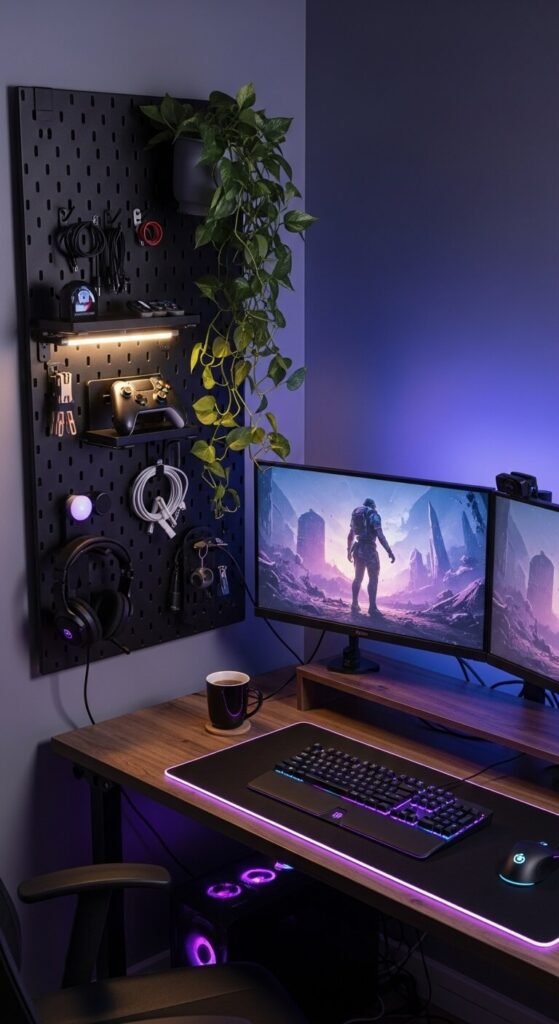 A pegboard beside a gaming or media desk handles all the accessories that clutter a desktop. Mount a headset hook so your headphones have a dedicated spot off your desk. Use a small shelf bracket to hold a controller charging dock. Run cable clips along the edge to manage wires from monitors and consoles. Add a small plant in a hanging planter for balance. A matte black board with black hooks disappears into a dark gaming room and looks completely intentional — like part of the original desk build.