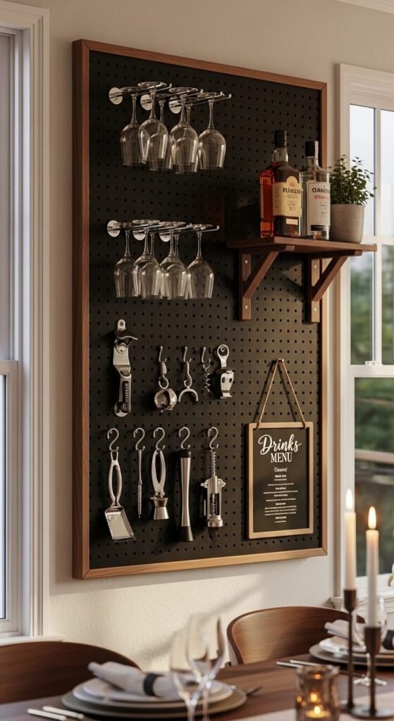 A pegboard drink station is a smarter alternative to a bulky bar cart. Mount it in a dining room or kitchen corner. Use specialized stemware hooks that hold wine glasses inverted so they stay dust-free and look elegant. Hang your bottle opener, cocktail tools, and a small chalkboard for writing the night’s menu. A shelf bracket holds spirit bottles at the right height. Frame the whole board in dark walnut for a high-end look. Total cost is under $50 for a setup that looks like it belongs in a boutique hotel.