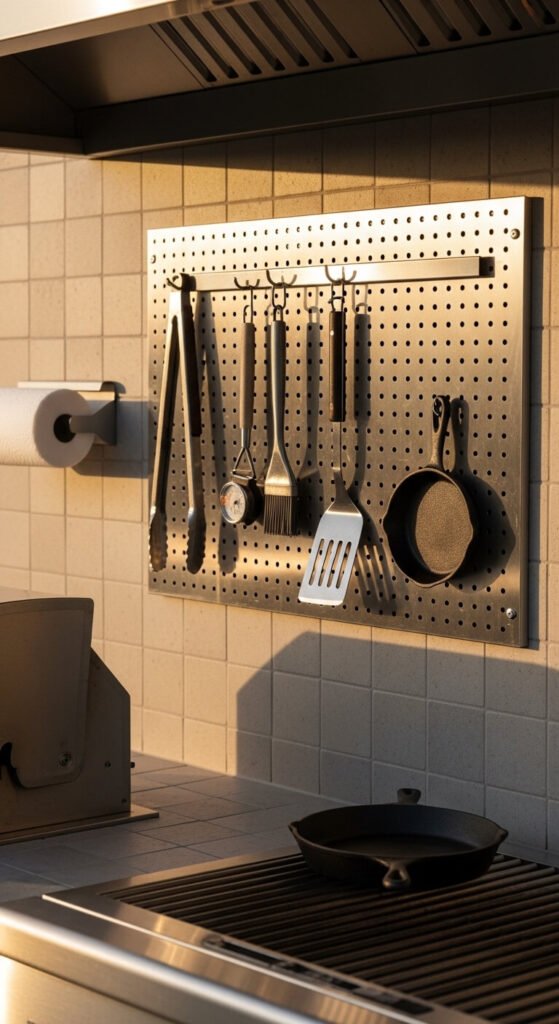 Keep your grill tools off the ground and out of a drawer. A stainless steel or weather-resistant pegboard panel beside your outdoor grill holds long-handled tools, a thermometer, and a paper towel holder right where you need them. This is one of the best applications for HDPE plastic or metal pegboard — standard hardboard will not hold up outdoors. Mount it to your fence, outdoor kitchen backsplash, or a standalone post. Everything you need to run a backyard cookout lives in one visible spot.